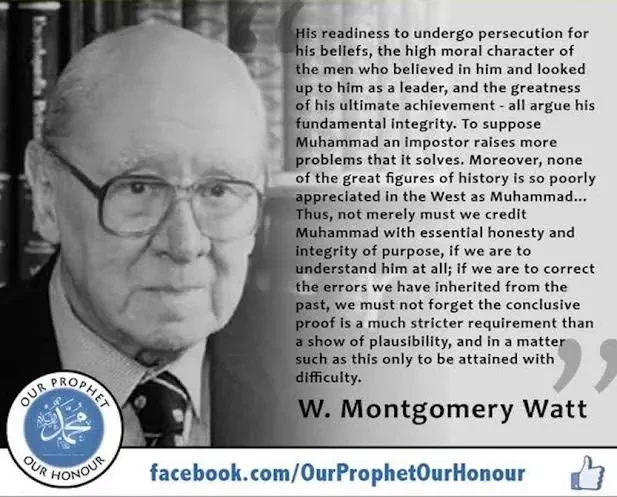 ایڈنبرا یونیورسٹی (ایمریٹس) میں عربی اور اسلامی علوم کے پروفیسر ولیم منٹگمری واٹ(William Montgomery Watt) سرور کونین صلی اللّٰہ علیہ وسلم کے بارے میں لکھتے ہیں:• "His readiness to undergo persecutions for his beliefs, the high moral character of the men who believed in him and looked up to him as leader, and the greatness of his ultimate achievement - all argue his fundamental integrity...Moreover, none of the great figures of history is so poorly appreciated in the West as Muhammad." (Mohammad At Mecca, Oxford, 1953, p. 52)